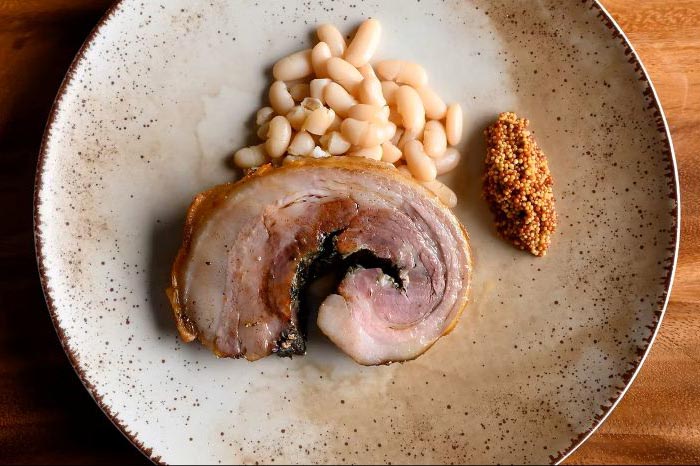 开胃菜、意面、主菜、番茄炖牛肚、白肝焦糖布丁、樱桃番茄和腌姜等。