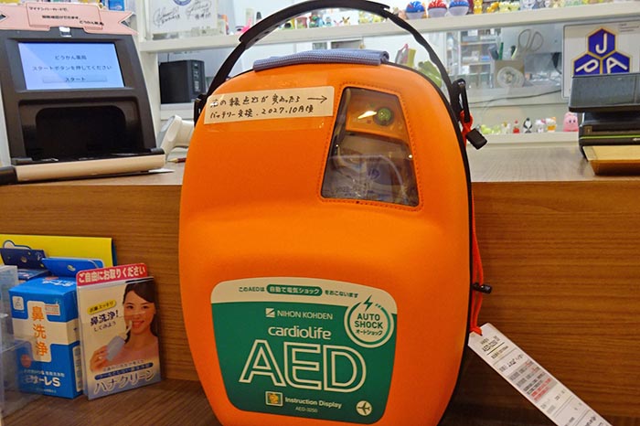 We entrusted Dōkan Yakkyoku (Dōkan Pharmacy) with the installation of this device. We aim to be prepared for any emergencies that may arise for all visitors to our shopping association. We would appreciate it if you keep this information in mind.